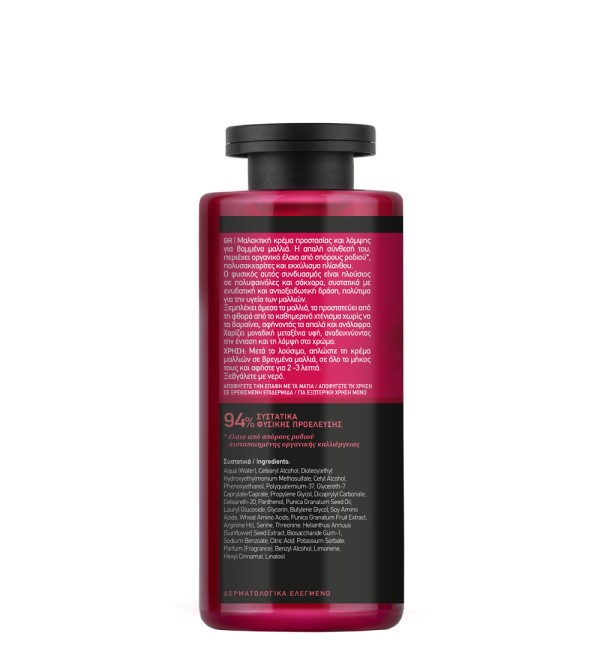 Балсам за боядисана коса с органично масло от семена от нар*, полизахариди и слънчогледово масло. Комбинация от естествени съставки, богати на плифеноли, танини и витамини – съставки с овлажняващо и антиоксидантно действие, основни за третиране на боядисана коса. Незабавно разплита косата и я защитава от ежедневно накъсване, причинено от разресване с четка. С лека формула и не утежнява косата. Възстановява копринената текстура на косата, прави я лесна за оформяне и ѝ придава блясък.